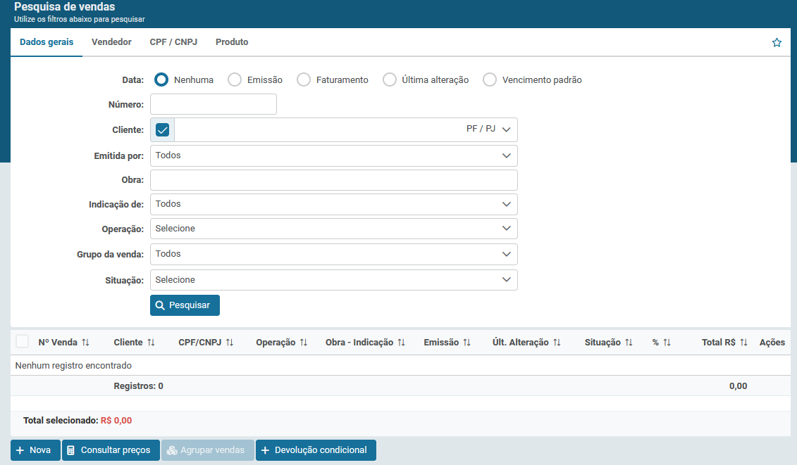 Esta funcionalidade permite que o usuário consulte, de forma rápida e estruturada, todas as vendas registradas no sistema, utilizando filtros como cliente, data, vendedor, CPF/CNPJ, produto, operação e situação da venda. A ferramenta oferece praticidade no acompanhamento do ciclo de vendas, facilita a gestão de clientes e operações comerciais e assegura maior controle e rastreabilidade sobre os resultados obtidos.