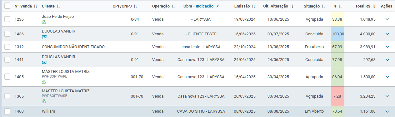 Obra/Indicação: nome da obra vinculada à venda ou responsável pela indicação.